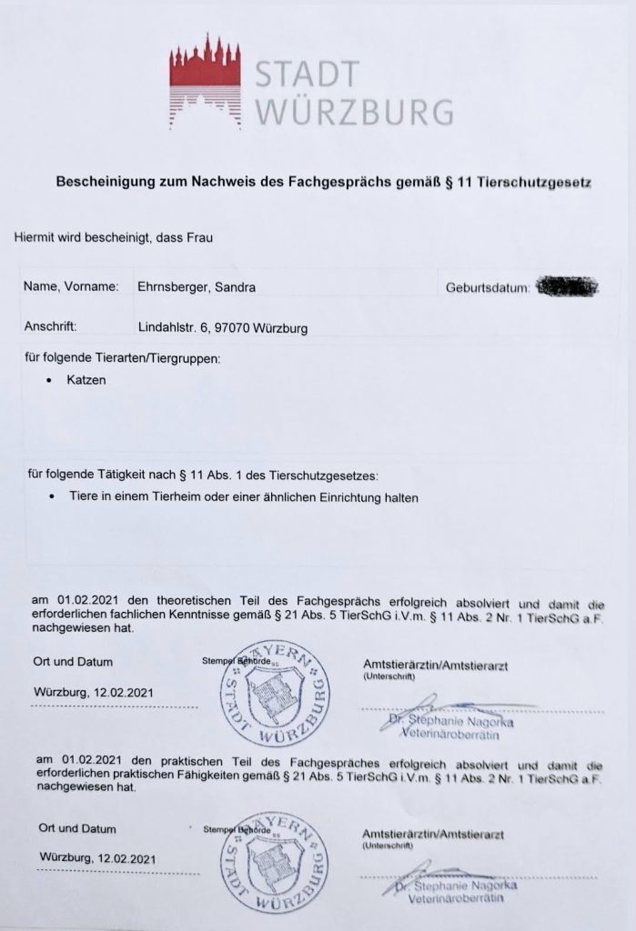 02/2021: Prüfung Sachkunde nach § 11 Tierschutzgesetz